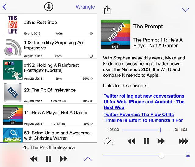 Pod Wrangler takes care of downloading the episodes in the background as they are available. Intelligently choosing the next episode to play and clearing up the files after you are done with them. There are plenty of podcast apps that let you build complicated rules for managing your queues and building complex rules for file deletion. Pod Wrangler heads firmly in the other directly.