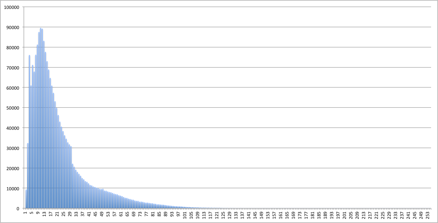 You can clearly see that the vast majority of app names are clustered around 10-15 characters long, with a steep drop off to the absurdly long ones.